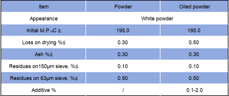 Properties: White powder. Little bitter. Density is 2.00. Soluble in alcohol, lightly soluble in water. No pollution to final products. Stabilization storage