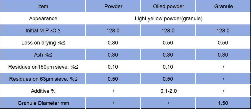 Properties: Pale yellow powder(granular).